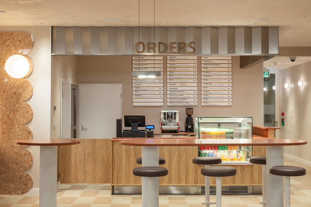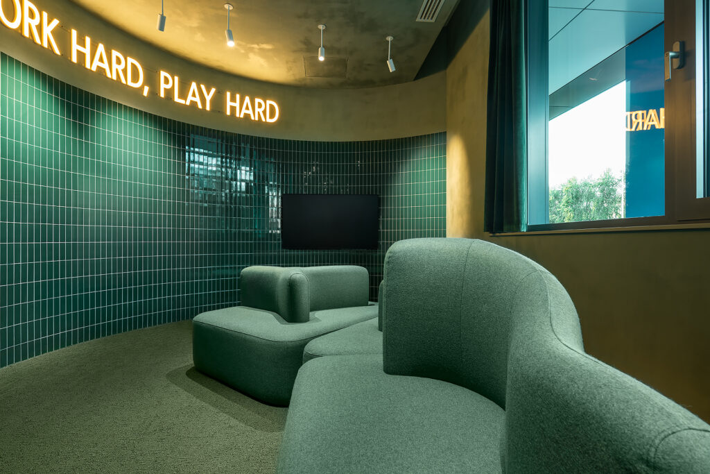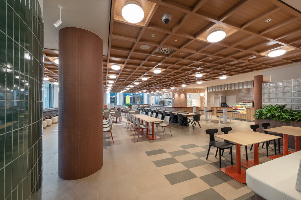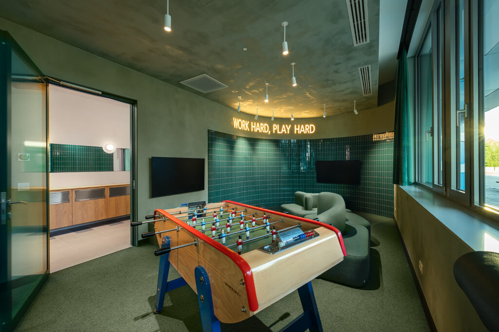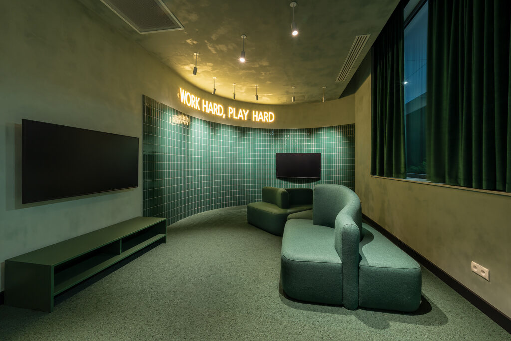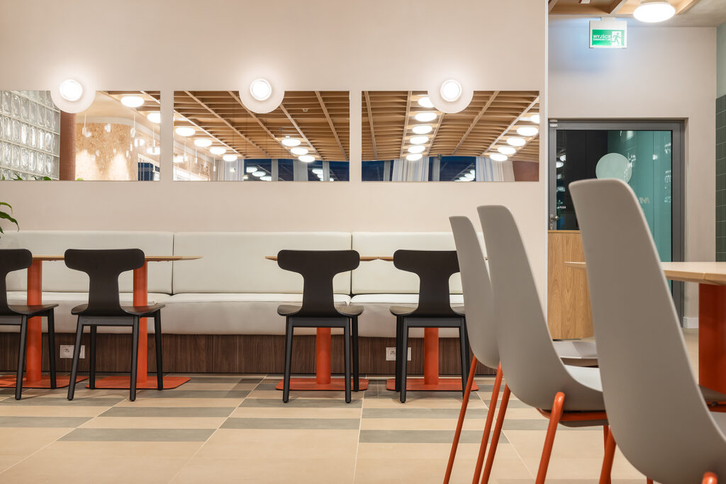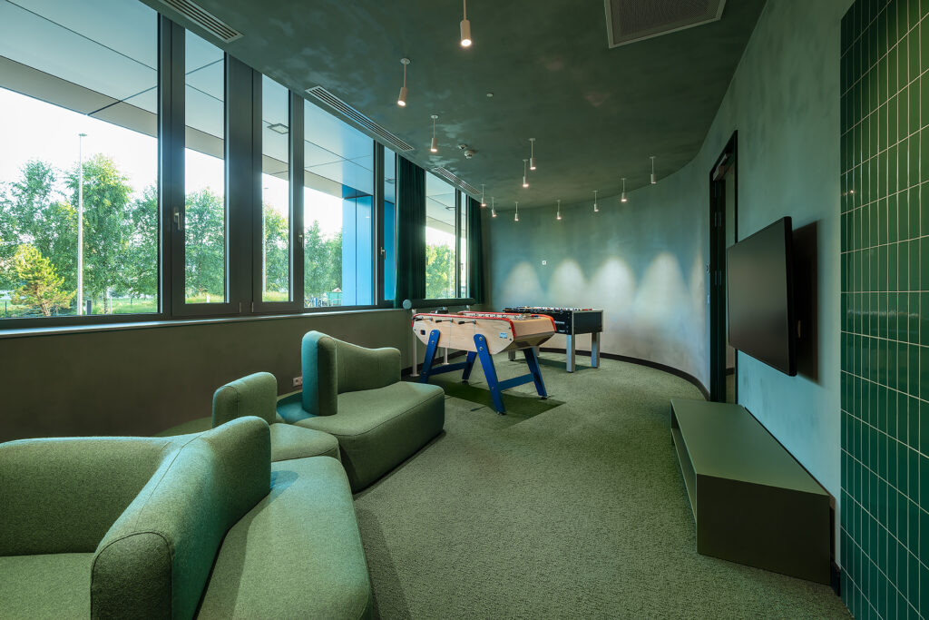 Sesja prezentująca bar i pomieszczenie relaksacyjne dla pracowników, projekt zrealizowany przez firmę Electrotechnics Control.