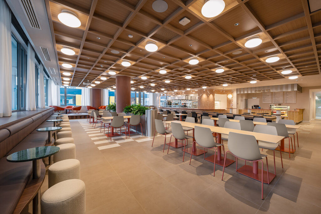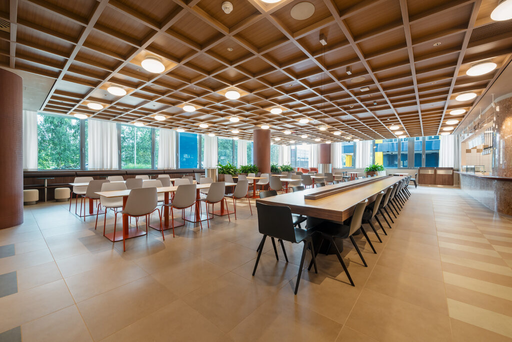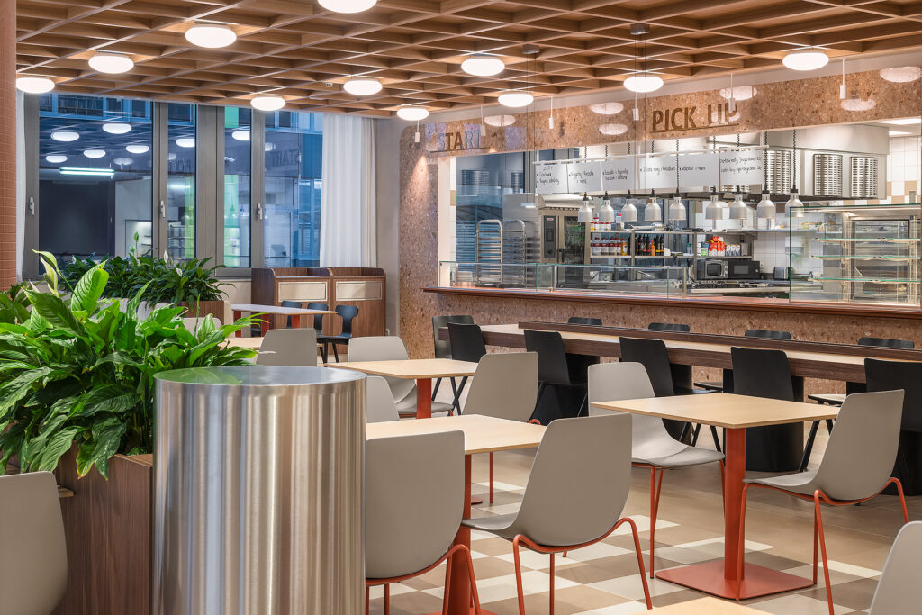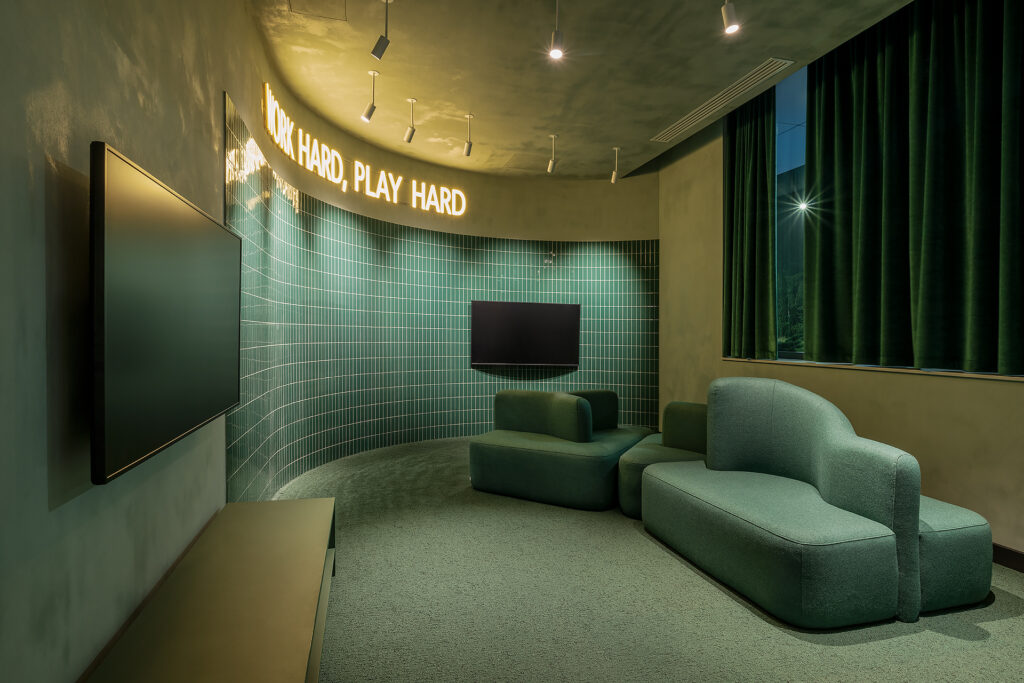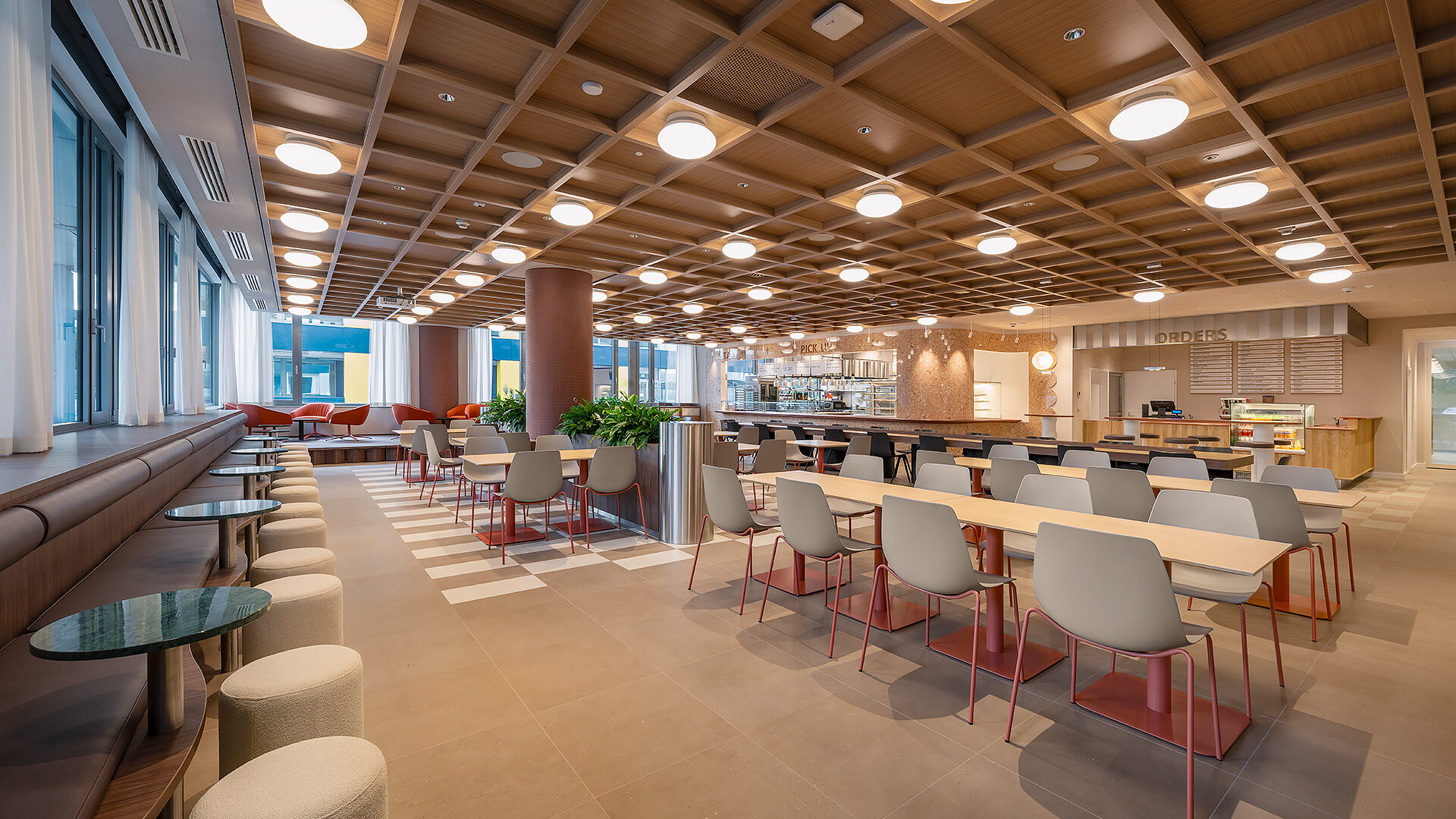 Sesja prezentująca bar i pomieszczenie relaksacyjne dla pracowników, projekt zrealizowany przez firmę Electrotechnics Control.