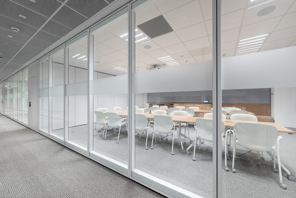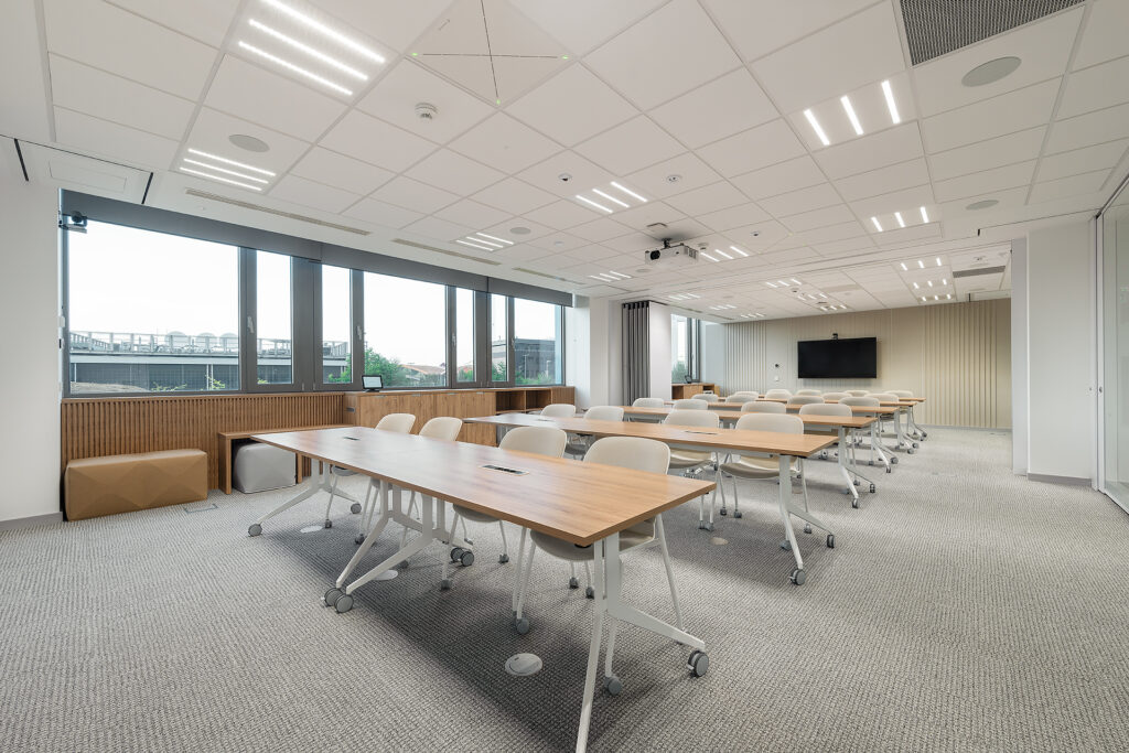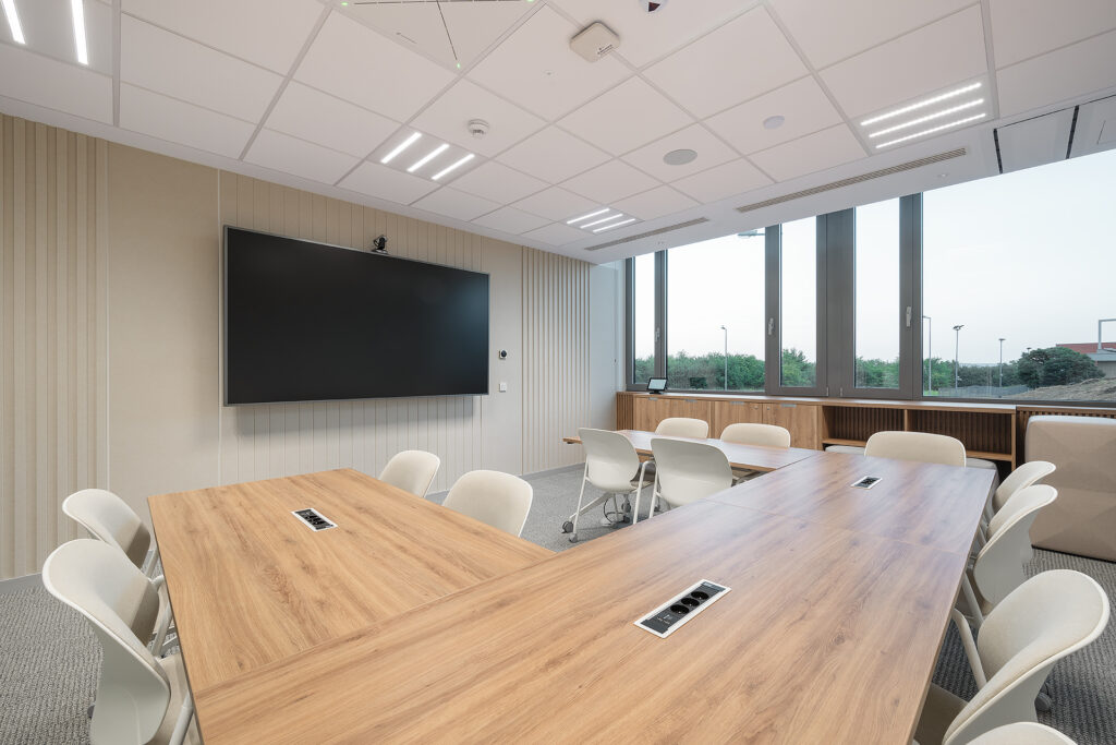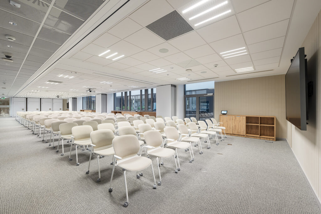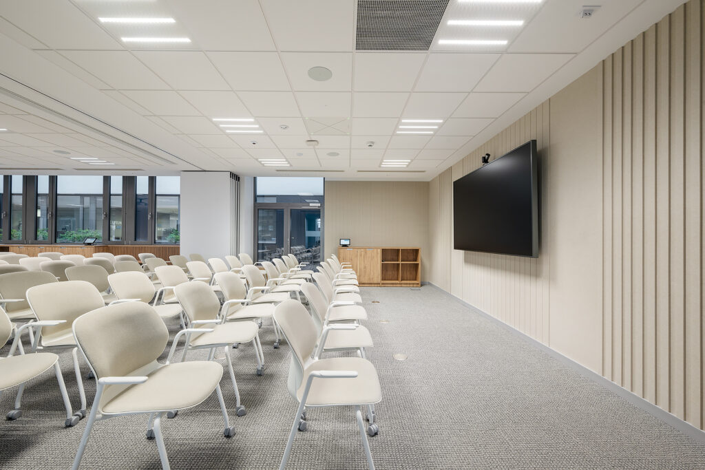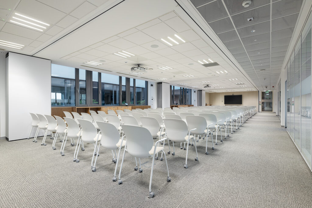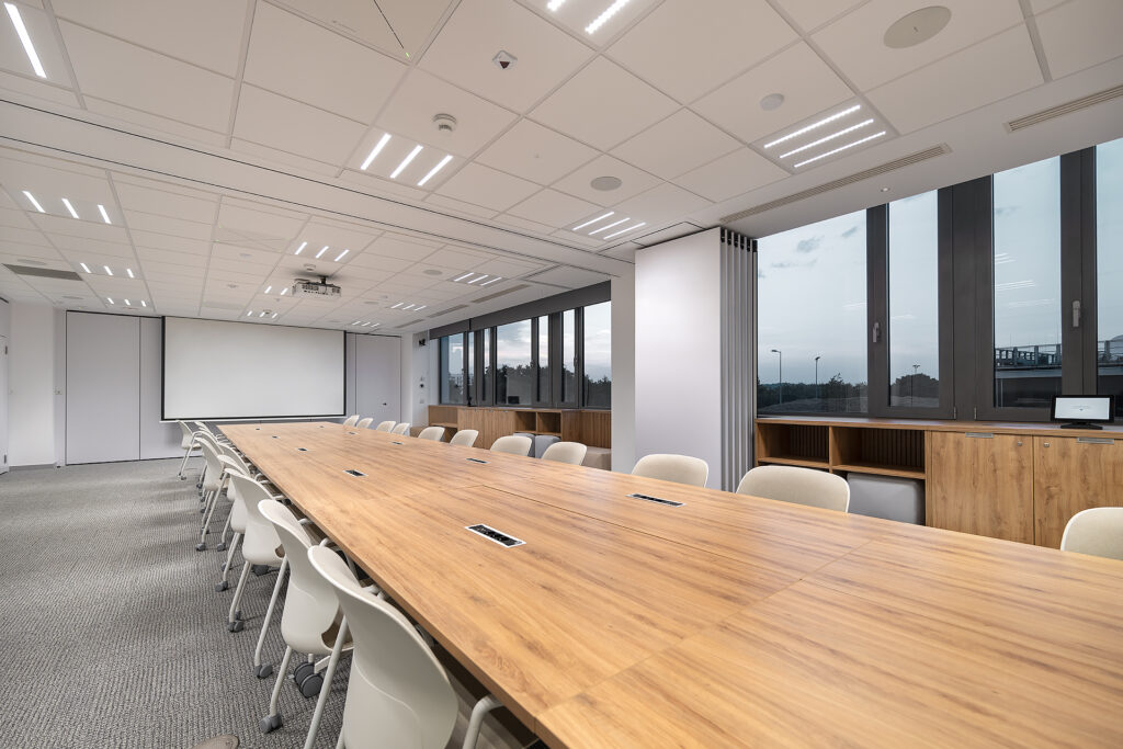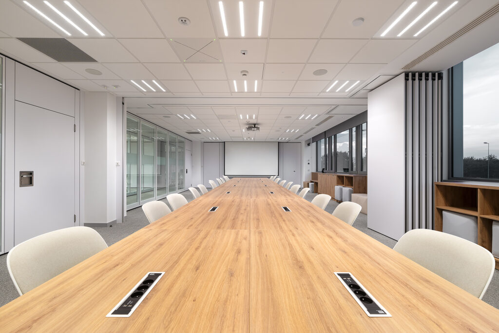Sesja prezentująca sale konferencyjne oraz pomieszczenie kuchenne. Przestrzeń została wyposażona w modułowy system organizacji, dzięki czemu możliwe jest dostosowanie wielkości sal konferencyjnych do aktualnych potrzeb – od dużej przestrzeni open space, po kameralne pokoje. Projekt zrealizowany przez firmę Electrotechnics Control.