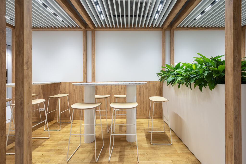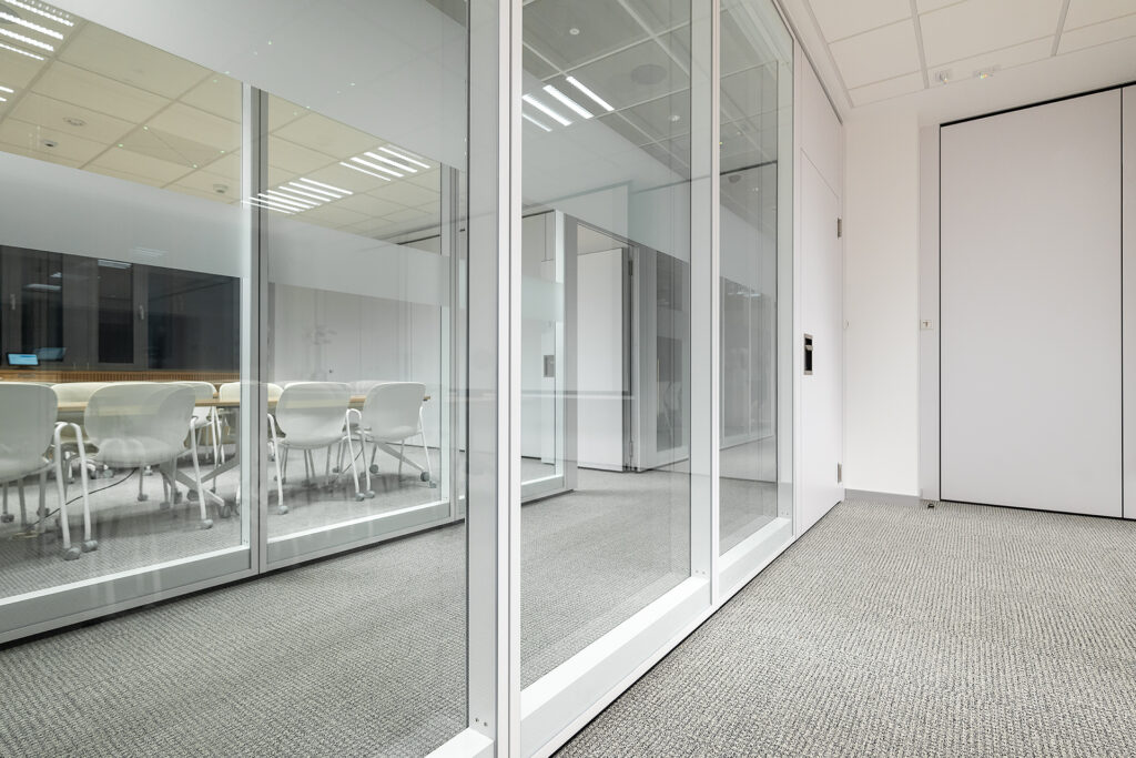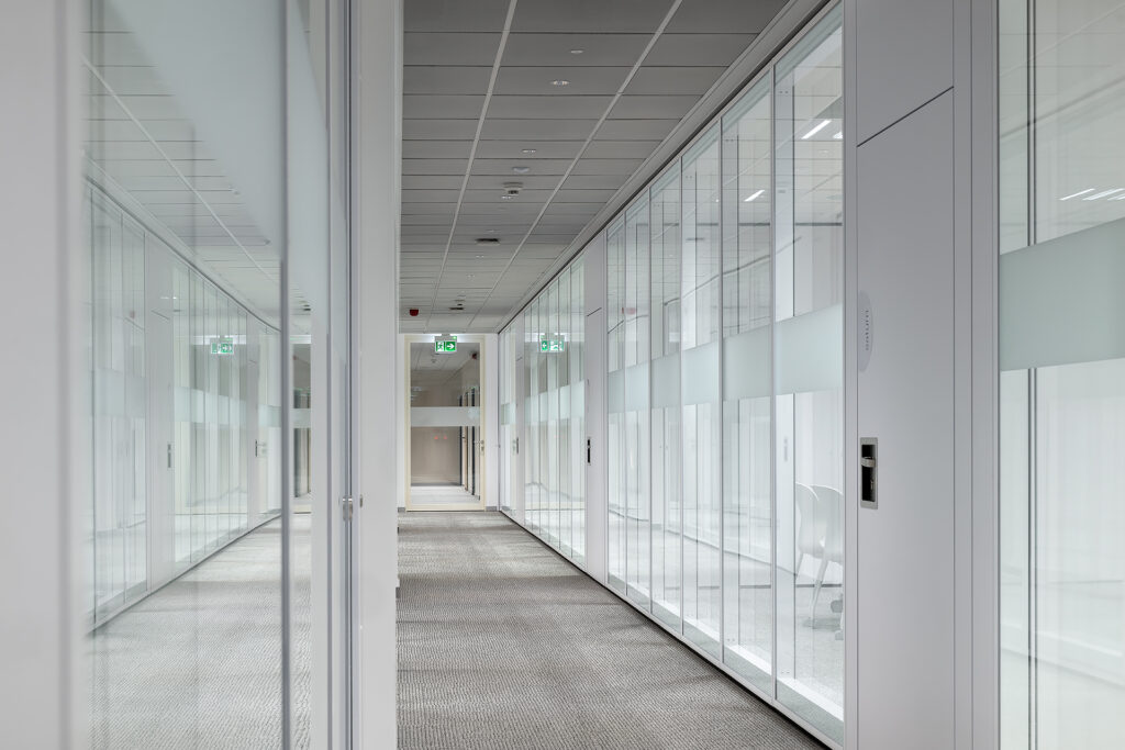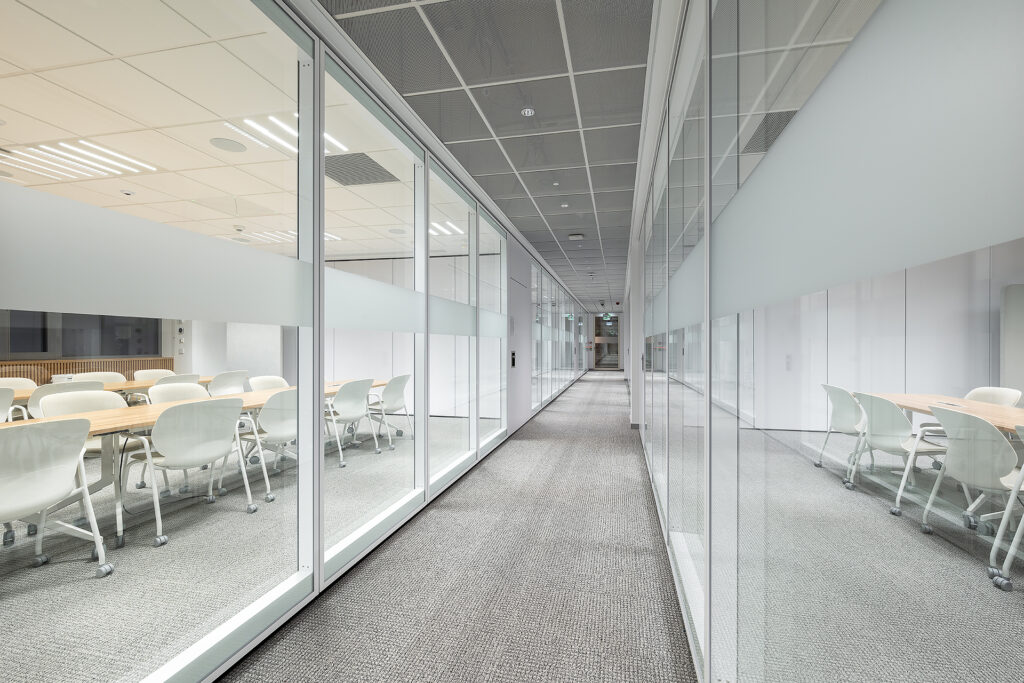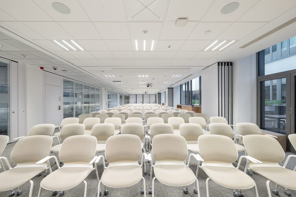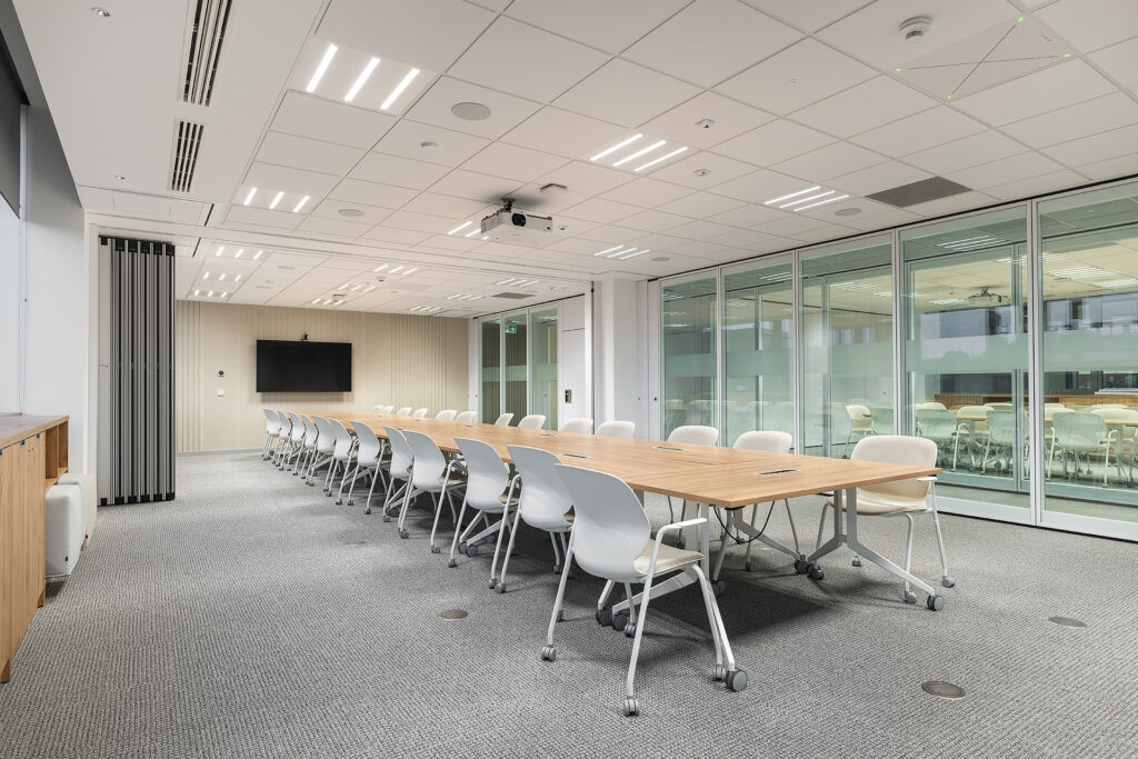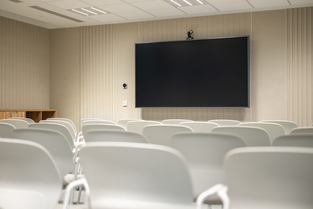 Sesja prezentująca sale konferencyjne oraz pomieszczenie kuchenne. Przestrzeń została wyposażona w modułowy system organizacji, dzięki czemu możliwe jest dostosowanie wielkości sal konferencyjnych do aktualnych potrzeb – od dużej przestrzeni open space, po kameralne pokoje. Projekt zrealizowany przez firmę Electrotechnics Control.