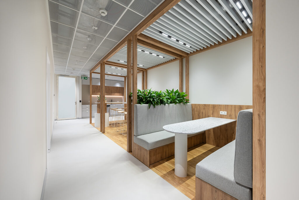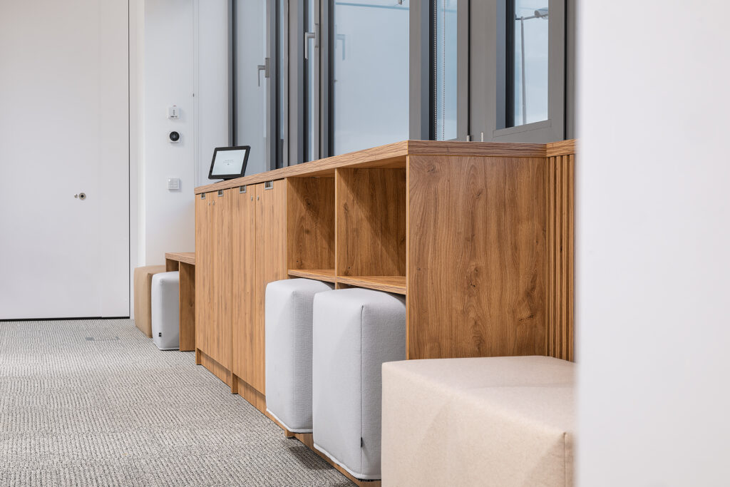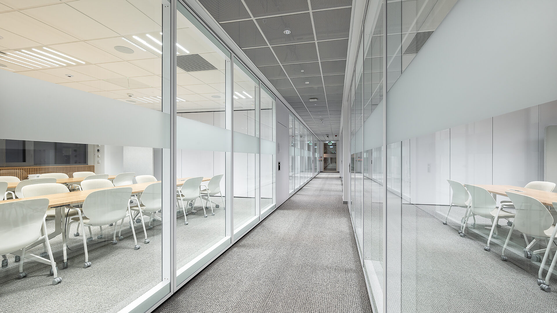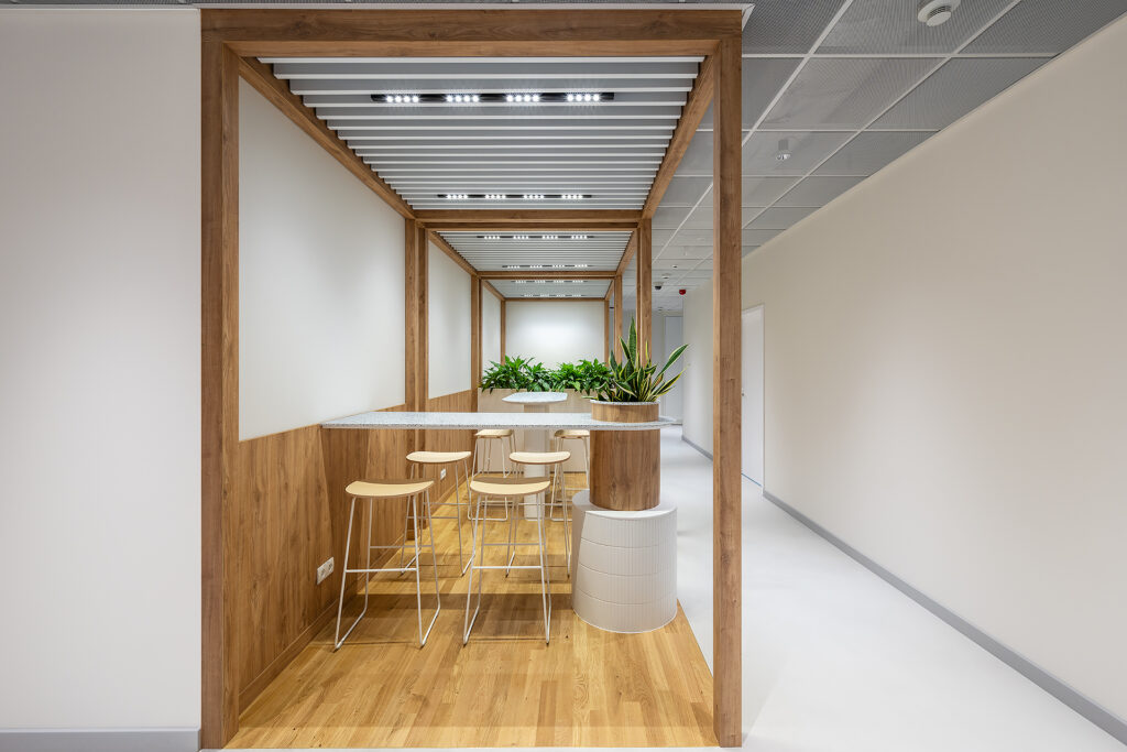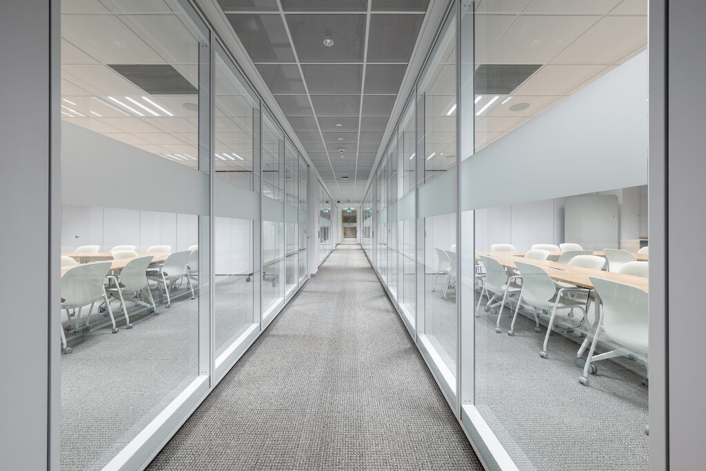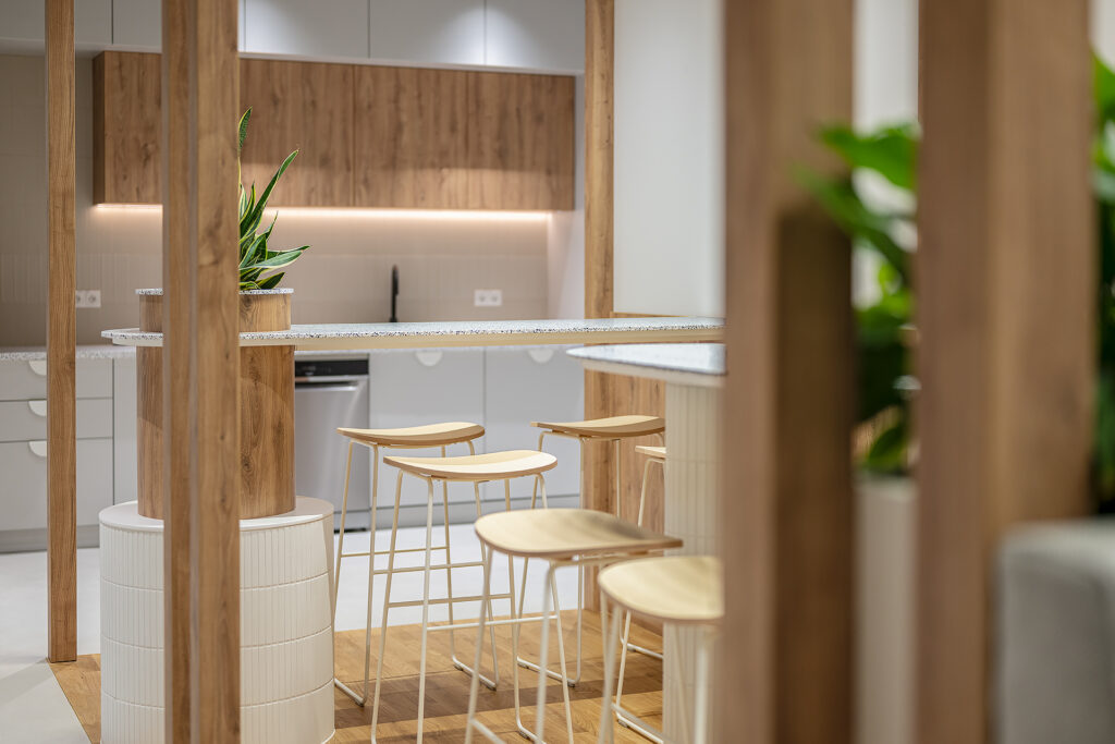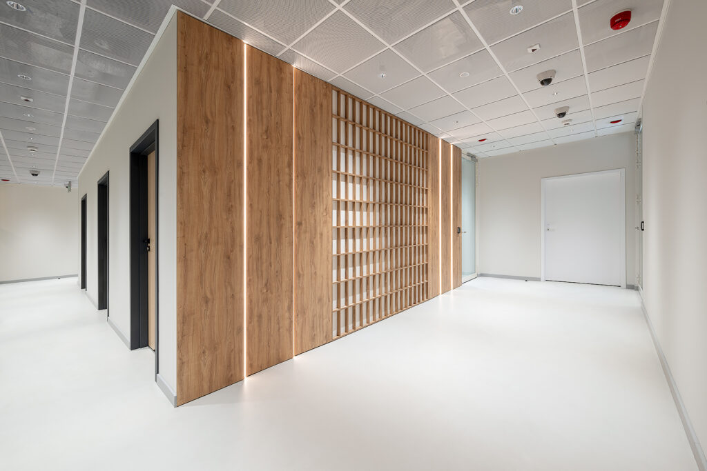 Sesja prezentująca sale konferencyjne oraz pomieszczenie kuchenne. Przestrzeń została wyposażona w modułowy system organizacji, dzięki czemu możliwe jest dostosowanie wielkości sal konferencyjnych do aktualnych potrzeb – od dużej przestrzeni open space, po kameralne pokoje. Projekt zrealizowany przez firmę Electrotechnics Control.